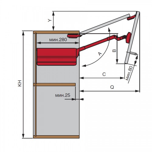 Не рекомендуем устанавливать подъёмный механизм на фасады без ручек. Минимальная высота установки ручки - 80 мм.