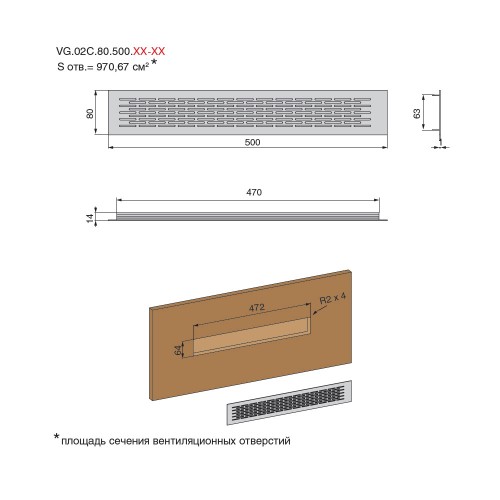 Вентиляционная решетка 02C, 500x80мм, отделка белая матовая RAL9003 (покраска)
